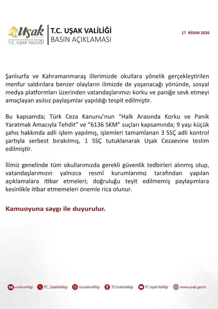 Uşak Valiliği sosyal medya üzerinden yapılan yazılı açıklamada, Şanlıurfa ve Kahramanmaraş illerinde okullara yönelik gerçekleştirilen saldırılara benzer olayların Uşak'ta da yaşanacağı yönünde sosyal medya platformları üzerinden vatandaşları korku ve paniğe sevk etmeyi amaçlayan asılsız paylaşımların tespit edildiği bildirildi. Söz konusu paylaşımlar üzerine başlatılan çalışmalar kapsamında yaşı küçük 9 kişi hakkında adli işlem yapıldığı belirtilerek, işlemleri tamamlanan 3'ünün adli kontrol şartıyla serbest bırakıldığı, 1'inin ise tutuklanarak cezaevine teslim edildiği kaydedildi.