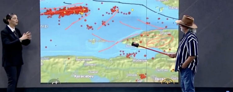 Üşümezsoy haritalar üzerinden fay hatlarını anlatırken Fulya Öztürk ise kendisine aile grubundan sürekli mesaj geldiğini söyledi.