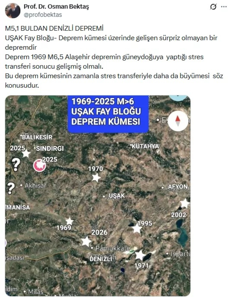Denizli'nin Buldan ilçesinde meydana gelen 5,1 büyüklüğündeki deprem, uzmanlara göre sürpriz değil. Deprem bilimci Prof. Dr. Osman Bektaş, sarsıntının Uşak Fay Bloğu üzerinde gelişen bir deprem kümesinin parçası olduğunu belirtti.