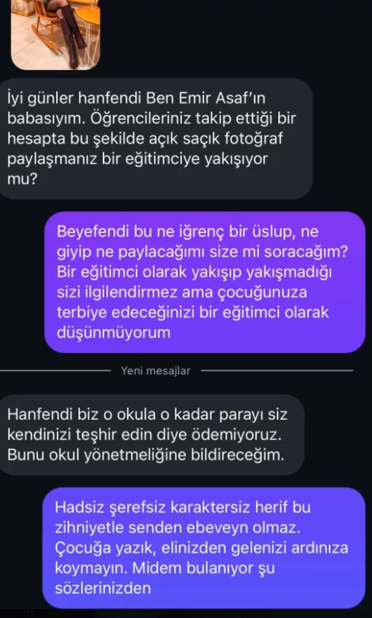 İddiaya göre veli, öğretmenin sosyal medya hesabında paylaştığı fotoğrafları eleştirerek, "Öğrencilerinizin takip ettiği bir hesapta bu şekilde açık saçık fotoğraf paylaşmanız bir eğitimciye yakışıyor mu?" ifadelerini kullandı. Mesajında öğretmenin paylaşımlarını uygun bulmadığını belirten veli, durumu okul yönetimine bildireceğini de dile getirdi.