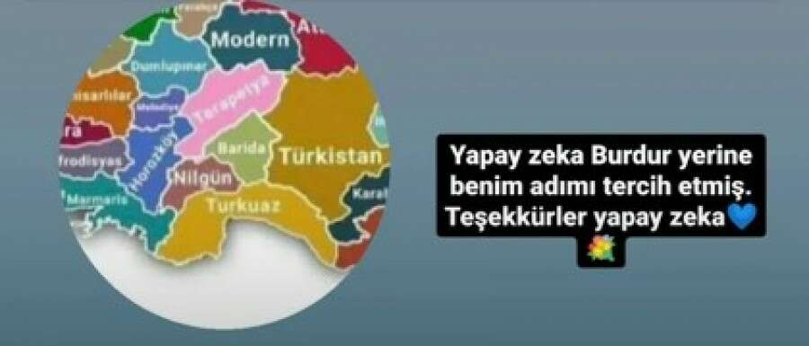 Yapay zekanın yeniden isimlendirdiği Türkiye haritasında Ankara'nın yeni ismi Atatürk olarak değiştirildi. Türkiye'nin en kalabalık nüfusa sahip şehri İstanbul'un ismi ise "İstarmoni" olarak değiştirildi.