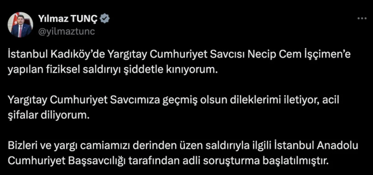 Adalet Bakanı Yılmaz Tunç, sosyal medya hesabındaki paylaşımda, İşçimen'e yapılan fiziksel saldırıyı şiddetle kınadığını belirterek şunları kaydetti: