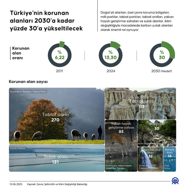 Çevre, Şehircilik ve İklim Değişikliği Bakanlığı, Türkiye'de korunan alan oranını 2030'a kadar yüzde 30'a çıkarmayı hedefliyor.