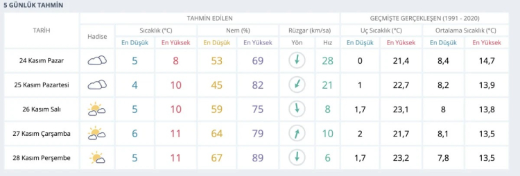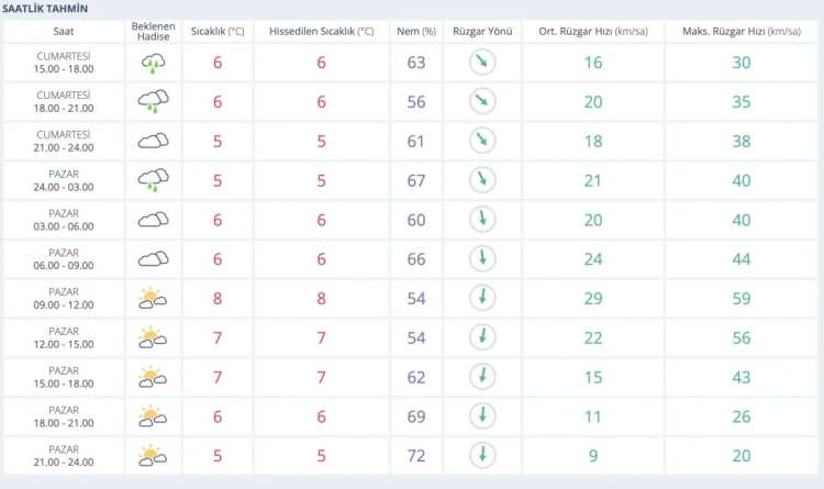 Parçalı ve çok bulutlu, öğle saatlerinden sonra yağmur ve sağanak yağışlı, yükseklerinin karla karışık yağmur ve kar yağışlı geçeceği tahmin ediliyor. Yağışların gece saatlerinde güney ve doğusunda kuvvetli olarak görülmesi bekleniyor. Rüzgârın; güneyli yönlerden kuvvetli olarak (40-70 km/saat) esmesi bekleniyor.