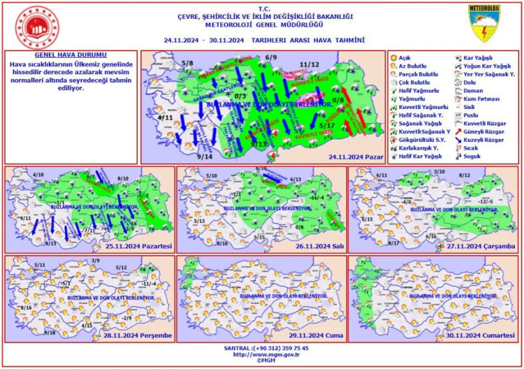 Meteoroloji Genel Müdürlüğü tarafından yapılan son tahminlere göre; yurdun genelinin parçalı ve çok bulutlu, Marmara, Ege, Akdeniz, İç Anadolu, Batı ve Orta Karadeniz ile Doğu Karadeniz kıyılarının yağışlı geçeceği tahmin ediliyor. Yağışların; genellikle yağmur ve sağanak, Kıyı Ege ile Batı Akdeniz kıyılarında yer yer gök gürültülü sağanak, Marmara’nın güneydoğusu, Batı Karadeniz’in iç kesimleri ile akşam saatlerinden sonra iç bölgelerde karla karışık yağmur ve kar şeklinde olması bekleniyor.