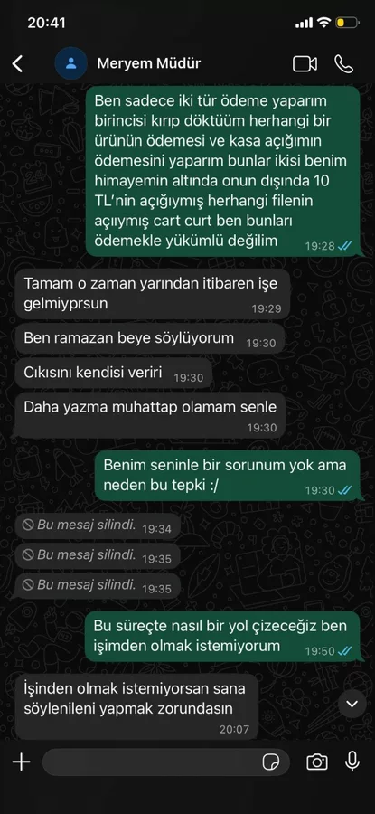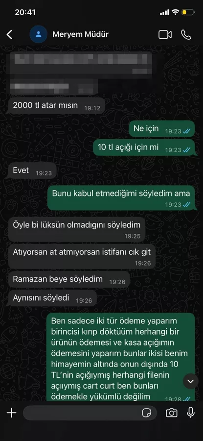 İddiaya göre çalışan, kendisinden istenen parayı ödemeyi reddettiği için işten çıkarıldığını ileri sürdü. Sosyal medyada paylaşılan mesajlaşmalarda, çalışanın "haraç" olarak nitelendirdiği ödemeyi yapmayı kabul etmediği, bunun ardından işten çıkarılmakla tehdit edildiği görüldü.
