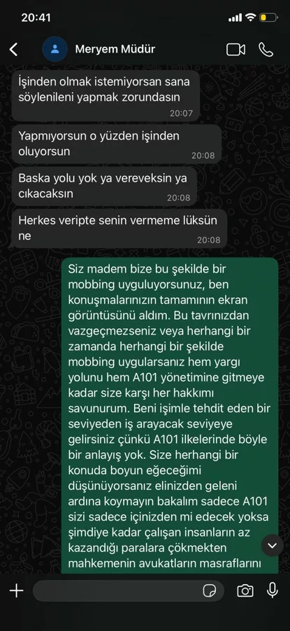 Paylaşılan yazışmalarda, üst konumdaki kişinin "İşinden olmak istemiyorsan söylenileni yapmak zorundasın" ve "Ya vereceksin ya çıkacaksın" şeklindeki ifadeleri dikkat çekti. Çalışanın ise bu durumu "mobbing" olarak nitelendirdiği ve hukuki yollara başvuracağını belirttiği görüldü.