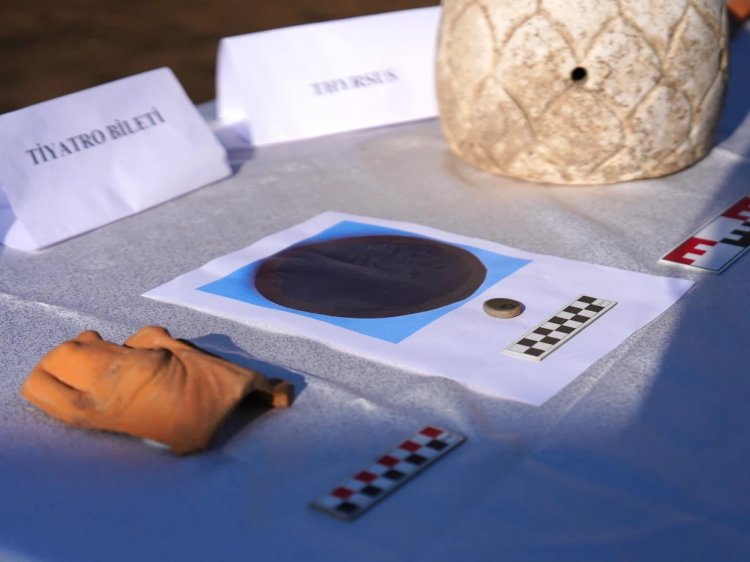 Kazılar çerçevesinde yaklaşık 2 bin yıl öncesine ait olduğu düşünülen ve pişmiş topraktan yapılan, üzerinde Roma rakamı ile V (5) yazan, ön yüzeyinde ise siyah firniş üzerinde kazıma tekniğinde gül motifi bulunan tiyatro bileti ile Dionysos heykeli asa başı Thyrsus bulundu.