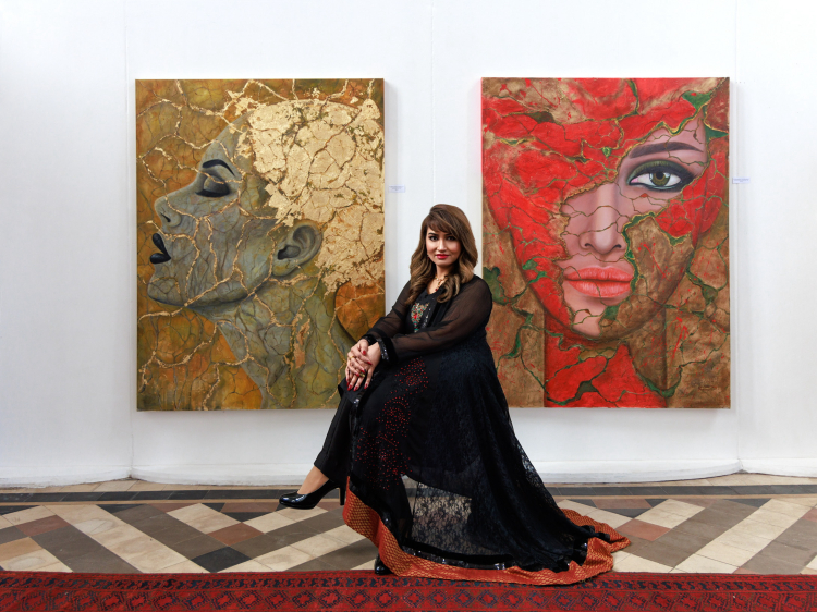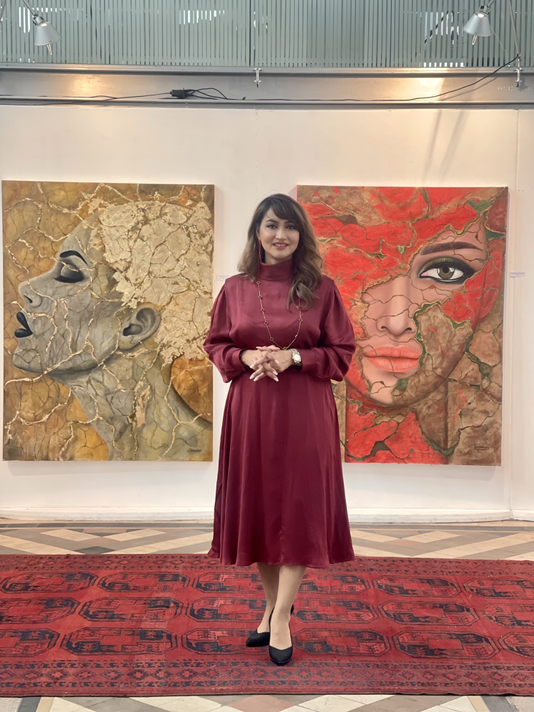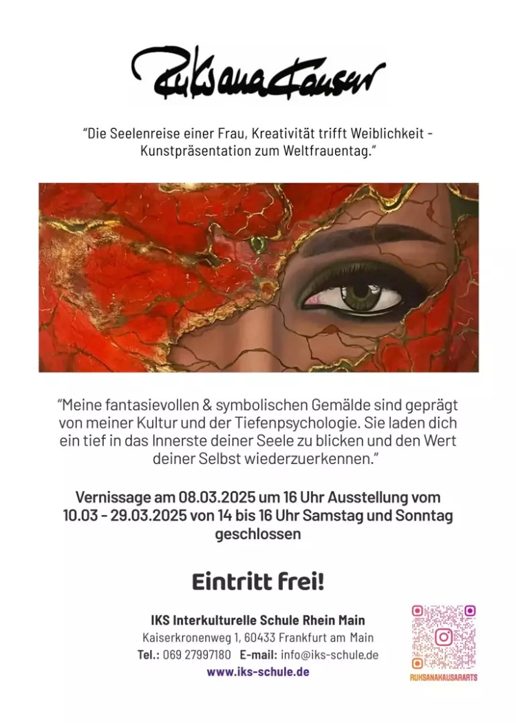 Pakistan doğumlu Frankfurtlu ressam Ruksana Kausar’ın ‘Bir Kadının Ruhsal Seyahati. Kadınlık ve Yaratıcılığın Buluşması’ başlıklı sergisi de sanatçının kendi kültürel kökenleri ve ruhsal derinliklerinden esinlenen sembolik kadın figürlerinden oluşuyor.