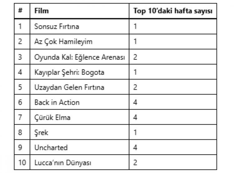 Filmler tarafına baktığımızda ise listenin çoğunda yeni içeriklerin yer alıyor. Listenin ilk sırasında Sonsuz Fırtına adlı yapım bulunurken hemen arkasından ikinci sırada Az Çok Hamileyim adlı yapım yer alıyor.