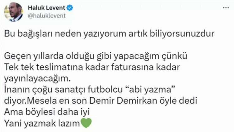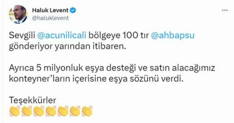 Haluk Levent, son olarak Acun Ilıcalı'nın da deprem bölgesi için büyük bir yardımda bulunduğunu şu sözlerle duyurdu: