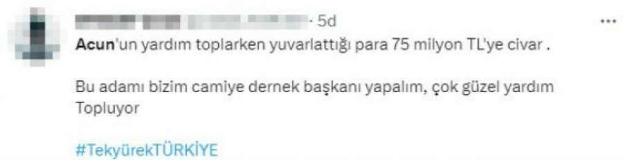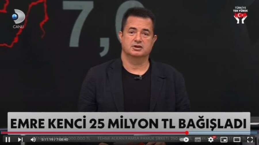 Depremzedeler için düzenlenen Türkiye Tek Yürek kampanyasında sunuculuk yapan Acun Ilıcalı'nın gelen bağış miktarını "Bunu yuvarlayalım" diyerek artırması sosyal medyada gündem oldu. 20 milyonluk bağışı artırarak 30 milyon yaptıran Ilıcalı'nın ekranda olduğu süre boyuncu ekstra 75 milyon topladığı ileri sürüldü.