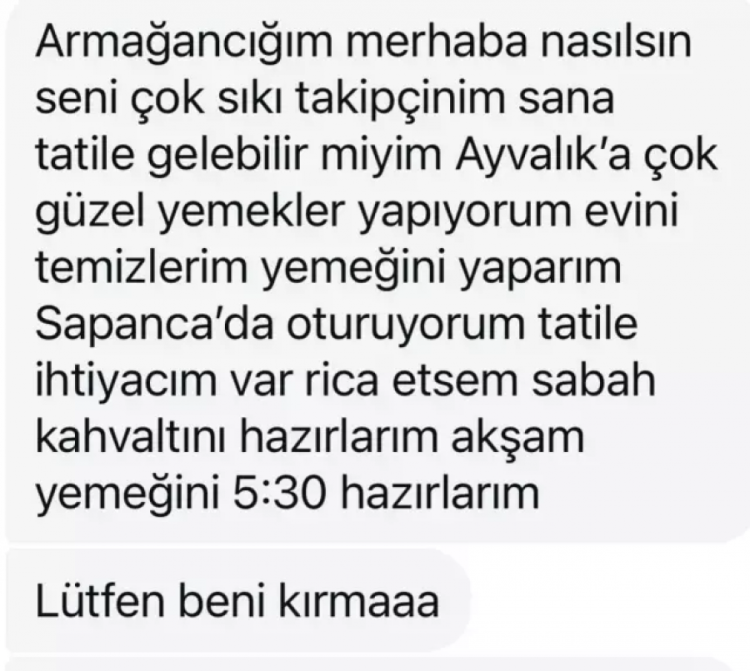 Son dönemde sosyal medyadaki paylaşımlarıyla sık sık adından söz ettiren Armağan Çağlayan, bu kez kendisine gelen özel bir mesajı ifşa etti. Tatil teklifinde bulunan takipçisinin ısrarcı mesajlarını alaycı bir dille paylaşan Çağlayan, "Ağzım açık okudum" diyerek şaşkınlığını dile getirdi.
