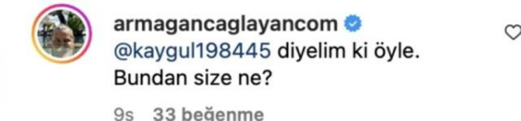 Armağan Çağlayan gelen bu yoruma çok sinirlendi ve "Diyelim ki öyle. Bundan size ne?" diyerek yanıt verdi. Çağlayan'ın bu yanıtı kısa sürede sosyal medyada gündem oldu.