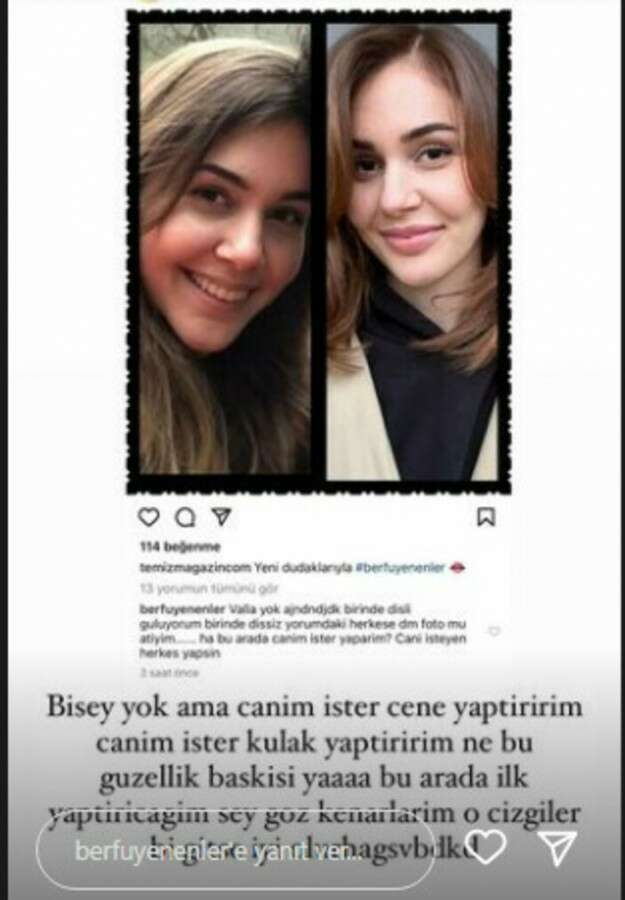 Berfu Yenenler daha sonra kendi sayfasında da o haberi paylaşıp "Canım ister çene yaptırırım canım ister kulak yaptırırım ne bu güzellik baskısı" diyerek isyan etti.