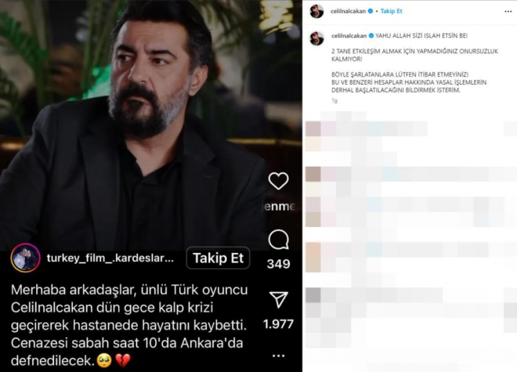 Celil Nalçakan, çıkan ölüm haberini Instagram hesabından yayınlayarak "Yahu Allah sizi ıslah etsin be. 2 tane etkileşim almak için yapmadığınız onursuzluk kalmıyor. Böyle şarlatanlara lütfen itibar etmeyiniz. Bu ve benzeri hesaplar hakkında yasal işlemlerin derhal başlatılacağını bildirmek isterim" ifadelerini kullandı.