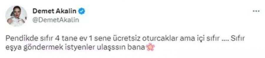 Türkiye, Kahramanmaraş'ta 6 Şubat'ta meydana gelen 7.7 ve 7.6 büyüklüğündeki depremlerle sarsılmıştı. 10 ilde yıkıma yol açan depremin yaralar sarılmaya çalışılırken, Demet Akalın depremzedeler için harekete geçmişti. Afet bölgesine yapılan yardımlara destek olan Akalın, Twitter hesabından İstanbul'un Pendik ilçesinde bulunan dört dairesini depremzedelerin kullanımına açacağını duyurmuştu.