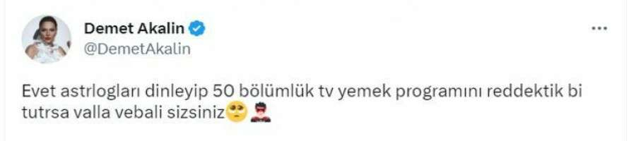 Akalın, programı reddetmesinin sebebinin ise danıştığı astrologlardan olumsuz yanıt alması olduğunu anlattı. 6.7 milyon takipçisi bulunan Twitter hesabından paylaşım yapan şarkıcı, şu ifadeleri kullandı: