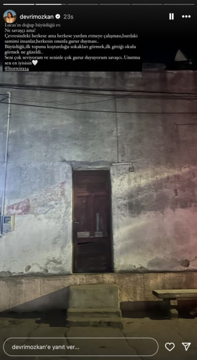 Ünlü oyuncu, sevgilisinin doğduğu evi paylaşarak, Torreira'ya övgü dolu sözler söyledi. Özkan; "Lucas'ın doğup büyüdüğü ev. Ne savaşçı ama! Çevresindeki herkese ama herkese yardım etmeye çalışması, buradaki samimi insanlar, herkesin onunla gurur duyması...Büyüdüğü, ilk topunu koşturduğu sokakları görmek, ilk gittiği okulu görmek ne güzeldi. Seni çok seviyorum ve seninle gurur duyuyorum savaşçı... Unutma en iyisisin" ifadelerini kullandı.