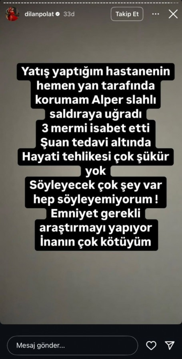Saldırıyı sosyal medya hesabından yaptığı paylaşımla duyuran Polat, korumasının yatış yaptığı hastanenin yan tarafında vurulduğunu aktardı.