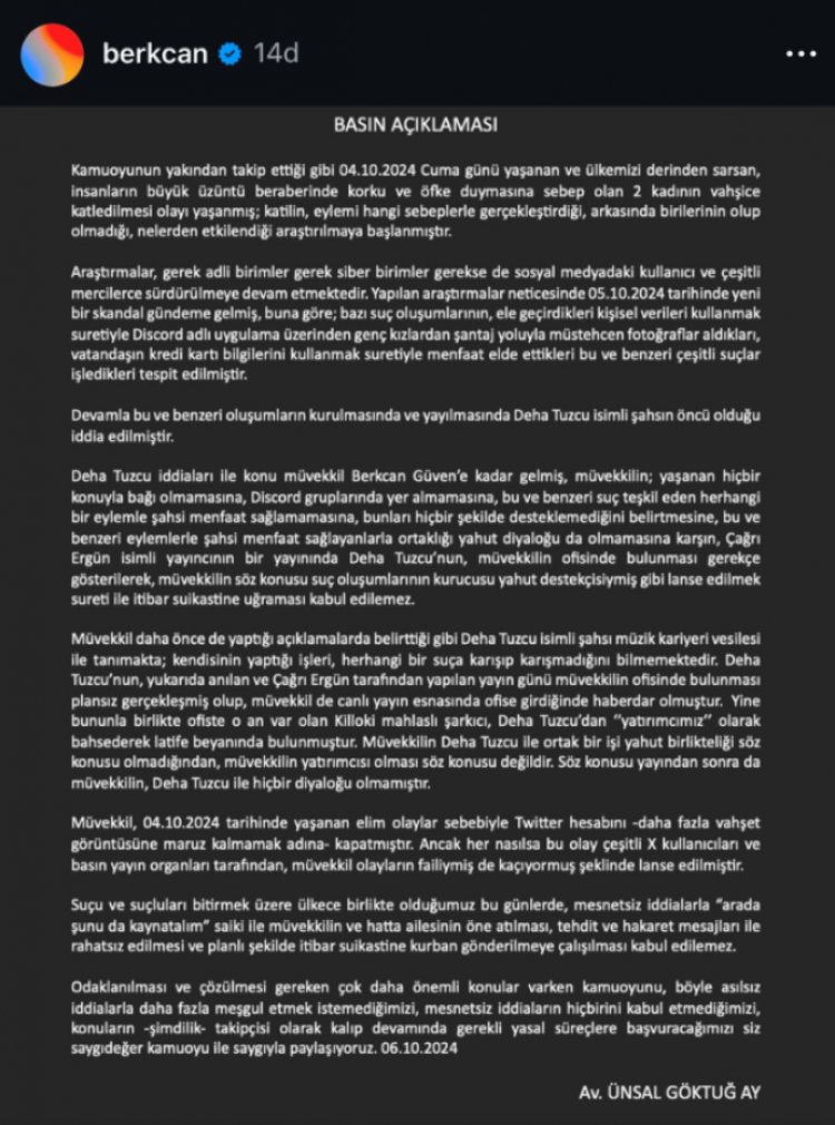 Deha Tuzcu ile arkadaş olduğu iddia edilen sosyal medya fenomeni Berkcan Güven'in gelen tepkilerin ardından X (Twitter) hesabını kapattığı öne sürüldü. Ünlü fenomen, gelen tepkilerin ardından sosyal medya hesabından bir açıklama yaparak bahsi geçen kişiyle kişisel bir bağının olmadığını, ortaya çıkan videolardan rahatsızlık duyduğunu belirtti.