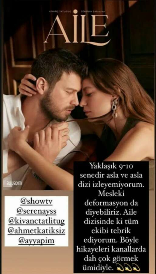 "Yaklaşık 9-10 senedir asla ve asla dizi izleyemiyorum. Mesleki deformasyon da diyebiliriz. Aile dizisindeki tüm ekibi tebrik ediyorum. Böyle hikâyeleri kanallarda daha çok görmek ümidiyle..."