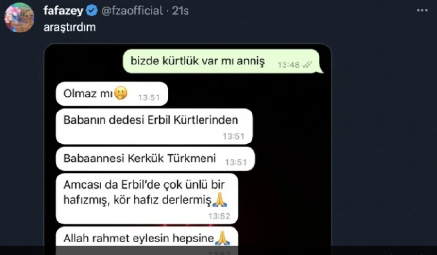 Annesine attığı mesajı yayınlayan ünlü oyuncu "Bizde Kürtlük var mı anniş?" mesajı üzerine annesinden "Olmaz mı" cevabını aldı.