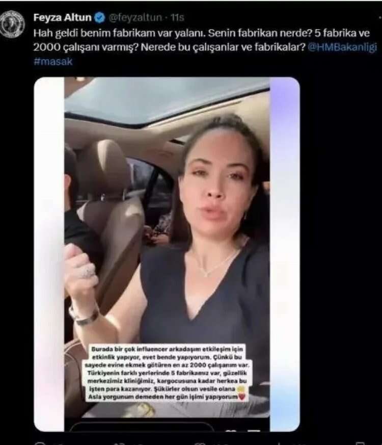 Özlem ve Tayyar Öz'ün kozmetik sattıkları firmayı 2021'de kurduğunu, 2022'de 245 bin TL vergi ödediğini dile getiren Feyza Altun, "2022 model bir Renge Rover 13-14 milyon. Bir milyon kâr edip 13 milyonluk arabaya binmek neredeyse imkansız gibi" dedi.