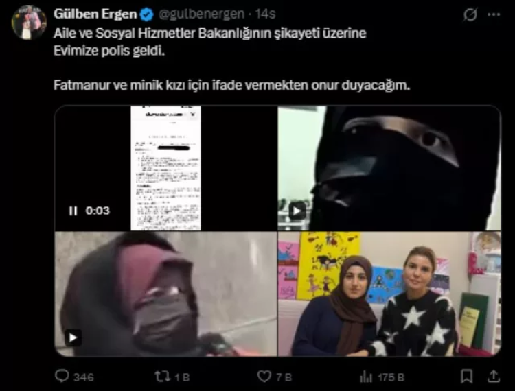 Gelişmeyi sosyal medya hesabından duyuran Gülben Ergen, "Aile ve Sosyal Hizmetler Bakanlığının şikayeti üzerine evimize polis geldi. Fatmanur ve minik kızı için ifade vermekten onur duyacağım" ifadelerini kullandı.