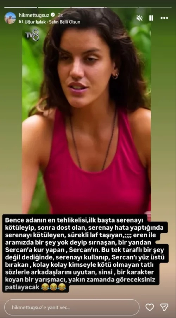 Survivor'ın eski yarışmacılarından Hikmet Tuğsuz, Instagram hesabından yaptığı paylaşımda Deniz'in ada içindeki tavırlarını hedef aldı. Tuğsuz, yarışmacının davranışlarını eleştirirken ada içindeki ilişkiler üzerinden de dikkat çeken ifadeler kullandı.
