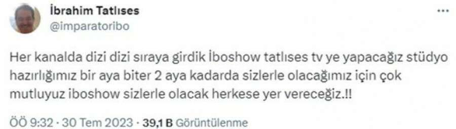 Konuyla ilgili olarak Twitter üzerinden sessizliğini bozan ünlü türkücü, "Her kanalda dizi dizi sıraya girdik. İbo Show'u Tatlıses TV'ye yapacağız. Stüdyo hazırlığımız bir aya biter, iki aya kadar da sizlerle olacağımız için çok mutluyuz. İbo Show sizlerle olacak herkese yer vereceğiz" ifadelerini kullandı.