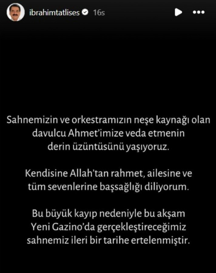 Acı haberi sosyal medya hesabından duyuran Tatlıses, "Sahnemizin ve orkestramızın neşe kaynağı olan davulcu Ahmet'imize veda etmenin derin üzüntüsünü yaşıyoruz. Kendisine Allah'tan rahmet, ailesine ve tüm sevenlerine başsağlığı diliyorum" ifadelerini kullandı.
