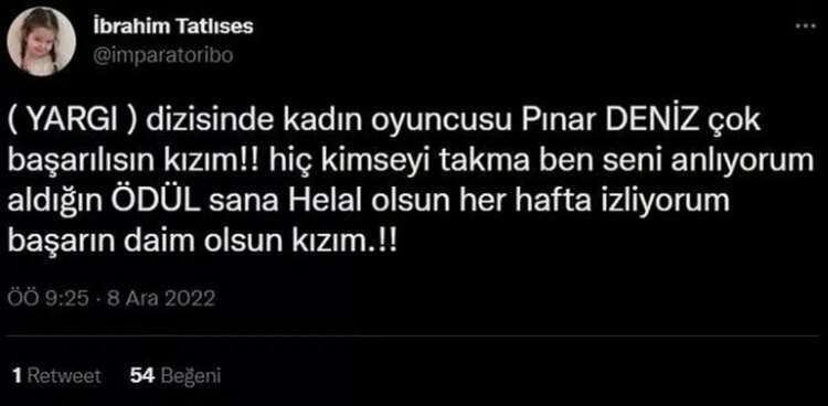 İbrahim Tatlıses açıklamasında "(YARGI) dizisinde kadın oyuncusu Pınar DENİZ çok başarılısın kızım! Hiç kimseyi takma ben seni anlıyorum aldığın ÖDÜL sana helal olsun her hafta izliyorum başarın daim olsun kızım" dedi.