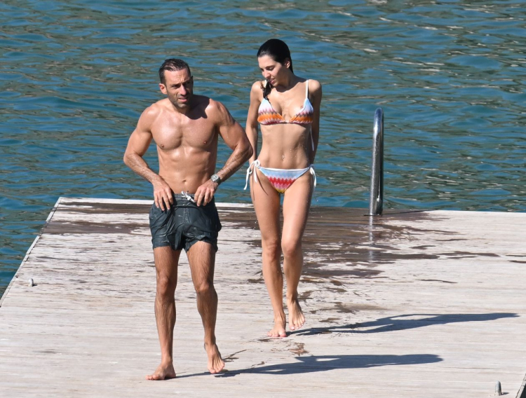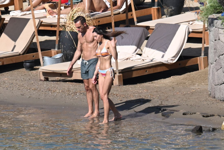Cennet Koyu'ndaki bir plajda görüntülenen Allen Hakko ile Pelin Uluksar, uzun süre güneşlendikten sonra birlikte denize girdi.