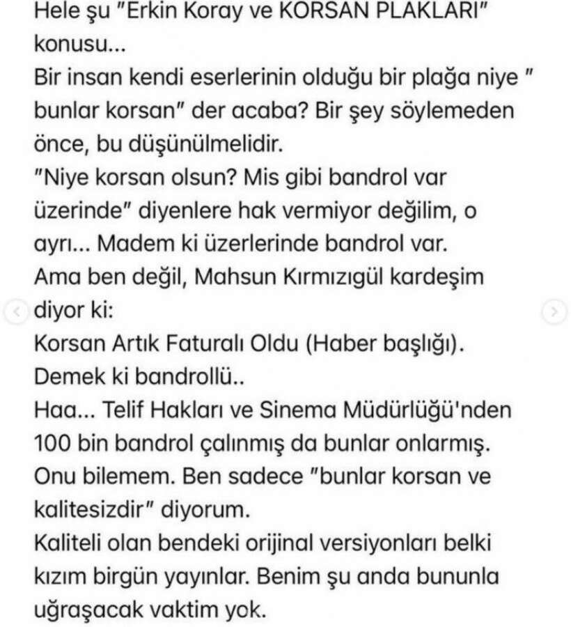 Anadolu rock müziğinin efsanevi ismi Erkin Koray, 82 yaşında hayatını kaybetti. Ölümünün ardından efsane isim anılırken müzik yazarı Kanat Atkaya değerli bir paylaşımda bulundu. Atkaya bir süre önce Erkin Koray'ın kendisine yazdığı mektubu paylaştı.