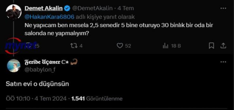 Şarkıcı "Ne yapacağım ben mesela 2,5 senedir 5 bine oturuyor 30 binlik bir oda bir salonda ne yapmalıyım?" diye sordu. Demet Akalın'a "Satın kurtulun" geldi.