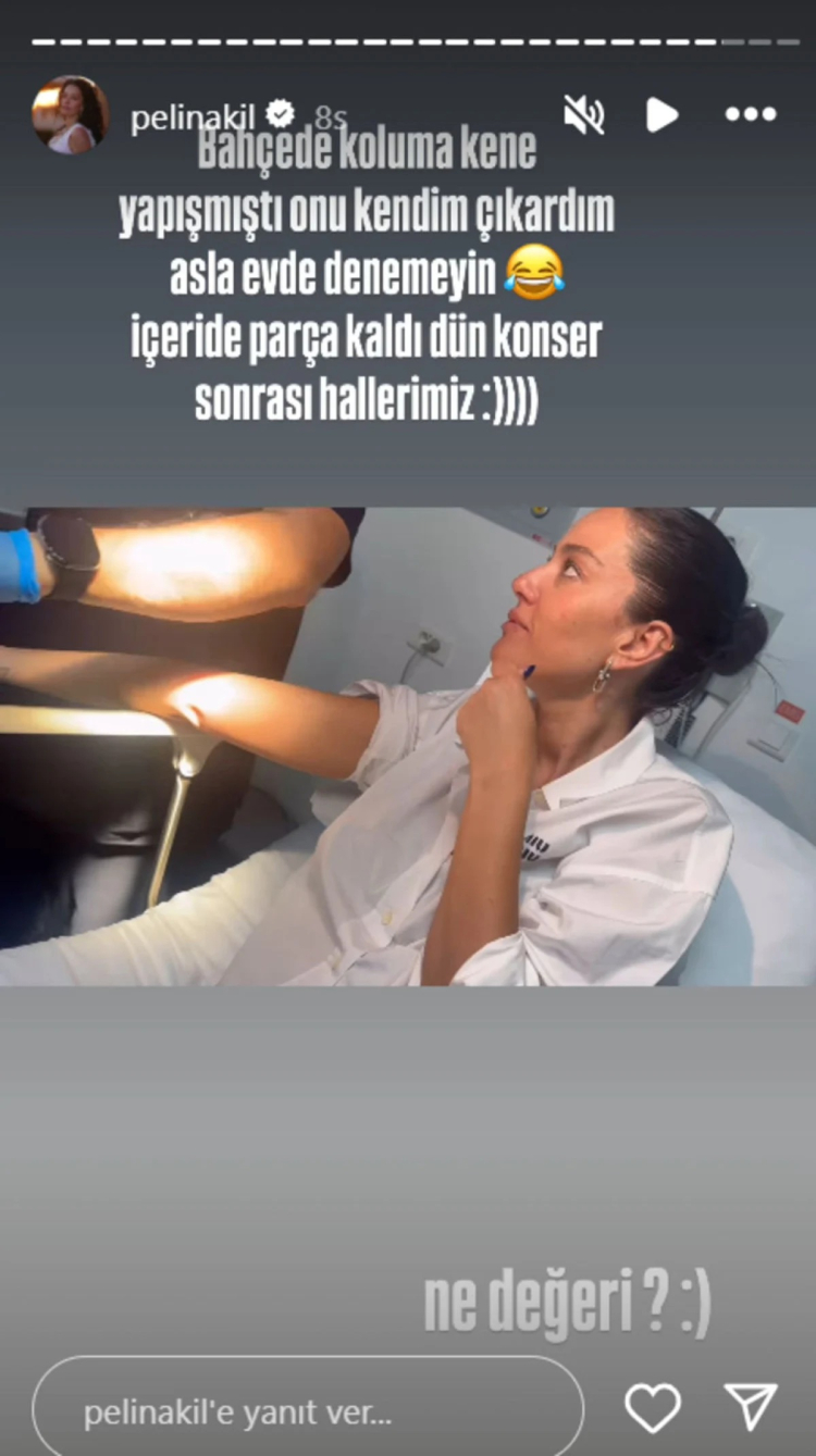 Koluna kene yapışan Pelin Akil; "Bahçede koluma kene yapışmıştı onu kendim çıkardım, asla evde denemeyin. İçeride parça kaldı, dün konser sonrası hallerimiz." dedi.
