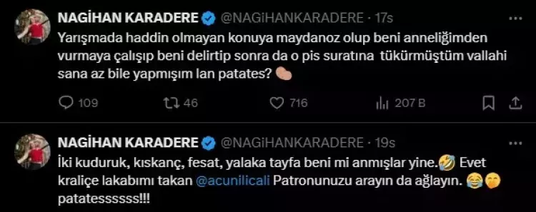 Bu konuşmayı gören Nagihan, sosyal medya hesabından "İki kuduruk, kıskanç, fesat, yalaka tayfa beni mi anmışlar yine. Evet kraliçe lakabımı takan Acun Ilıcalı, patronunuzu arayın da ağlayın. patatessssss!!!" ifadelerini kullandı ve şunları söyledi: "Yarışmada haddin olmayan konuya maydanoz olup beni anneliğimden vurmaya çalışıp beni delirtip sonra da o pis suratına tükürmüştüm vallahi sana az bile yapmışım lan patates?"
