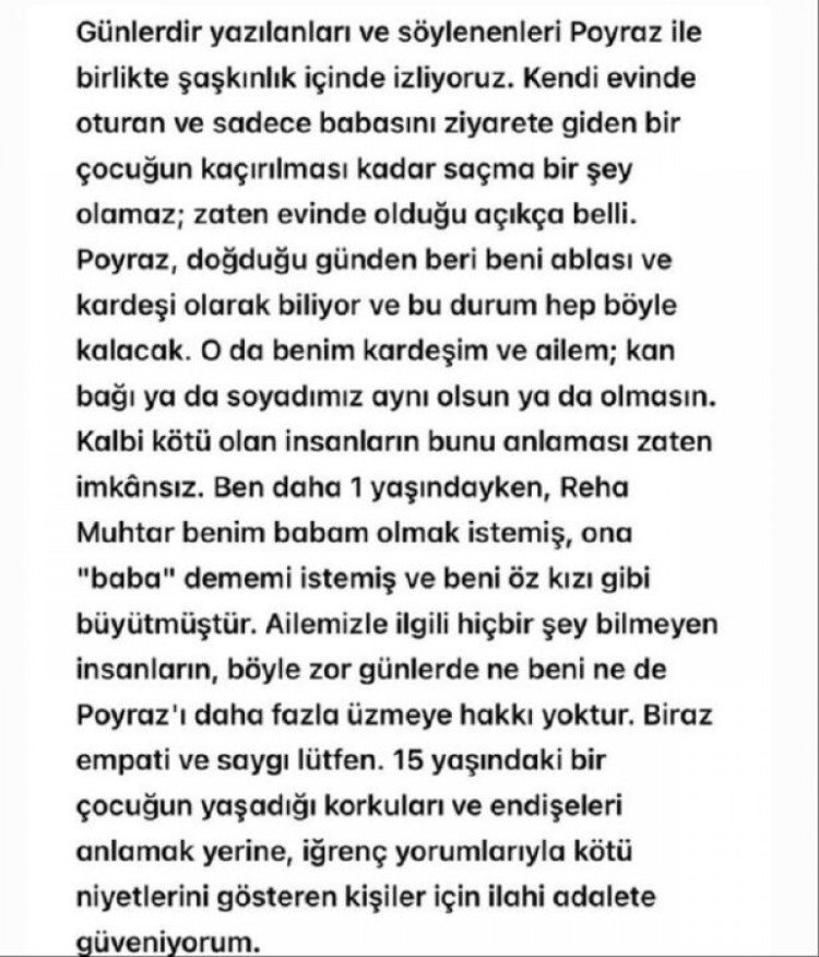 Sosyal medya hesabından bir açıklama yapan Ayşe Nazlı, "Günlerdir yazılanları ve çizilenleri Poyraz'la birlikte şaşkınlıkla izliyoruz. Kendi evinde oturan ve sadece babasını ziyarete giden bir çocuğun kaçırılması kadar saçma bir şey olamaz, zaten evinde olduğu açıkça belli. Poyraz, doğduğu günden beri beni ablası ve kardeşi olarak biliyor ve bu durum hep böyle kalacak" dedi.