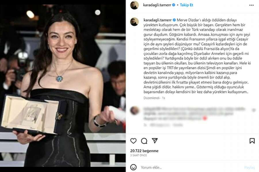 Cannes'da kazandığı 'en iyi kadın oyuncu' ödülüyle bu başarıya ulaşan ilk Türk kadın olan Merve Dizdar'ın konuşmasına bir tepki de Tamer Karadağlı'dan geldi.