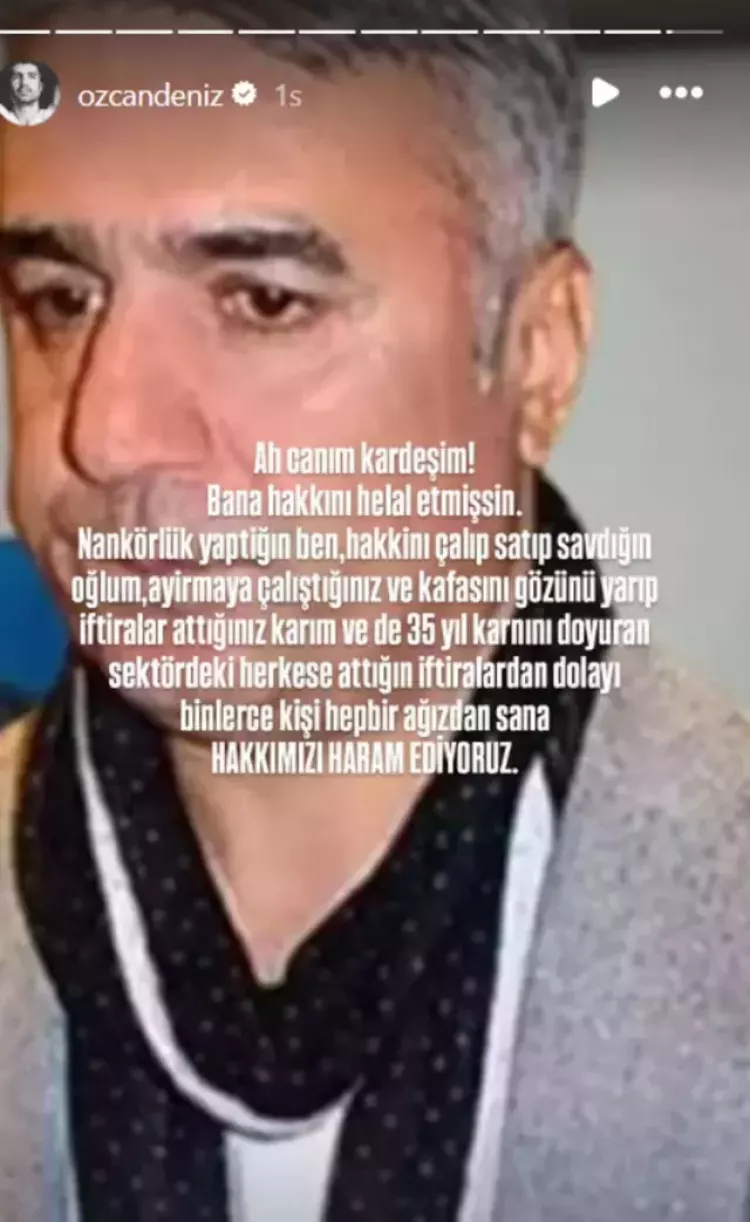 Özcan Deniz, "Ah canım kardeşim!" vurgusuyla başladığı paylaşımında "Bana hakkını helal etmişsin. Nankörlük yaptığın ben, hakkını çalıp satıp savdığın oğlum, ayırmaya çalıştığınız, kafasını gözünü yarıp iftiralar attığınız karım ve de 35 yıl karnını doyuran sektördeki herkese attığın iftiralardan dolayı binlerce kişi hep bir ağızdan SANA HAKKIMIZI HARAM EDİYORUZ" ifadelerine yer verdi.