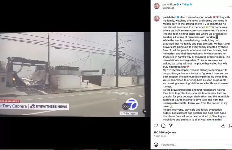 Kaliforniya eyaletinin Los Angeles kenti, şiddetli rüzgarların etkisiyle adeta her yer cehenneme döndü. Yangınlar, ünlülerin gözde mekanlarından biri olan ve milyonlarca dolarlık evlerin bulunduğu Pacific Palisades'teki gösterişli villaları küle çevirdi. Ünlü sosyal medya fenomeni Paris Hilton, Los Angeles'taki evinin yangında yandığını sosyal medya hesabı üzerinden duyurdu. Canlı yayında evinin yanışını izleyen Hilton, duygusal bir mesaj paylaştı: