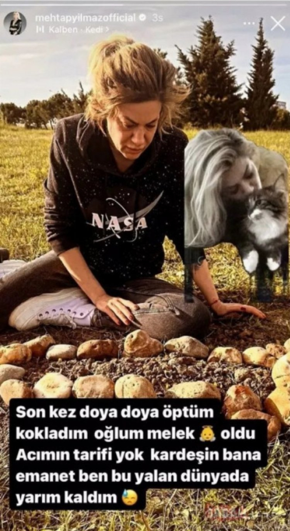 Kaybettiği kedisinin mezarı başında duygusal anlar yaşayan Mehtap Yılmaz, "Son kez doya doya öptüm, kokladım. Oğlum melek oldu. Acımın tarifi yok. Kardeşin bana emanet. Ben bu yalan dünyada yarım kaldım." şeklinde yazmıştı.