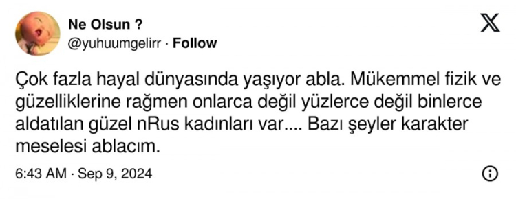 Rus olduğu iddia edilen bir kadının sosyal medyadan yaptığı paylaşımı tepkilere neden oldu. Rus kadını ile Türk kadını arasında karşılaştırma yapmak isteyen kadın "Türk kadınlarının haftada 5 gün başı ağrıyor" diyince eleştiri oklarının hedefi oldu. O anlara sosyal medyadan yorum yağdı.