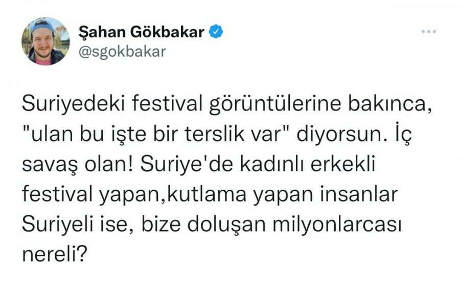 Ünlü komedyen Şahan Gökbakar, Suriye'de düzenlenen festivalle ilgili tepki gösterdi. Gökbakar, "Kutlama yapan insanlar Suriyeli ise bize doluşan milyonlarcası nereli?" dedi.