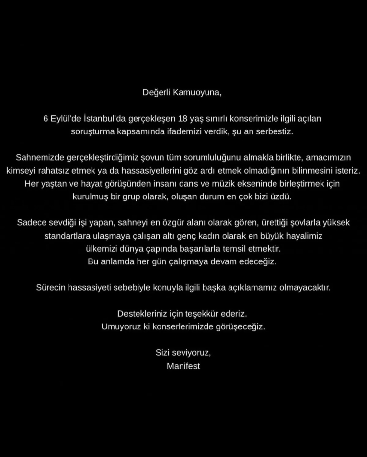 İstanbul konseri sonrası haklarında “hayasız hareketler” ve “teşhircilik” suçlarından re’sen soruşturma başlatılan ve adli kontrolle serbest bırakılan "Manifest" grubundan ilk açıklama geldi.