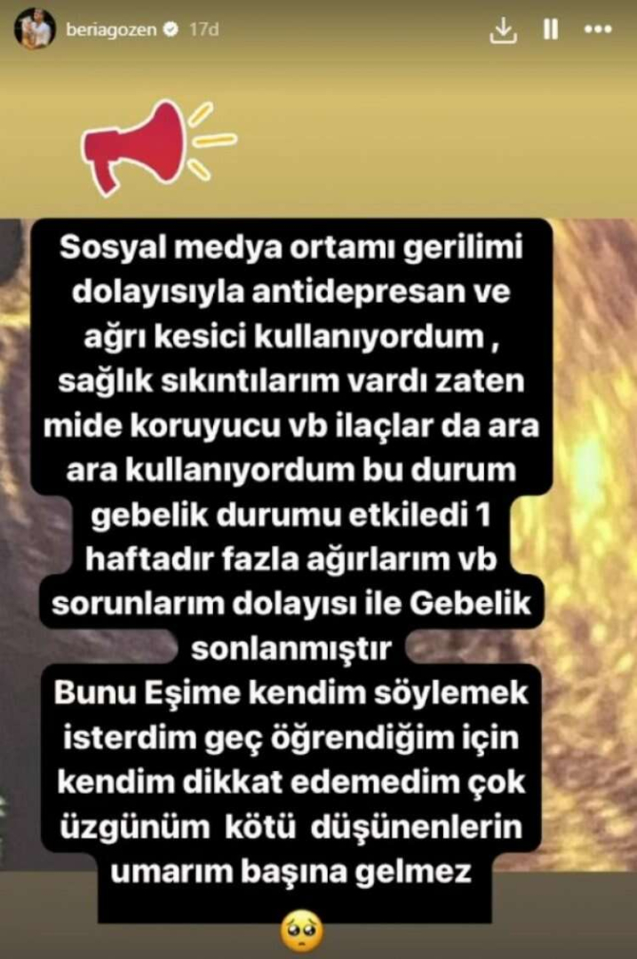 Geçirdiği zor durumdan bahseden Beria Özden şu ifadeleri kullandı: "Sosyal medya ortamı, gerilimi dolayısıyla antidepresan ve ağrı kesici kullanıyordum. Sağlık sıkıntılarım vardı zaten mide koruyucu vb. ilaçlar da ara ara kullanıyordum. Bu durum gebeliği etkiledi. 1 haftadır fazla ağrılarım vb. sorunlarım dolayısıyla gebelik sonlanmıştır. Bunu eşime kendim söylemek isterdim geç öğrendiğim için kendim dikkat edemedim çok üzgünüm. Kötü düşünenlerin umarım başına gelmez".