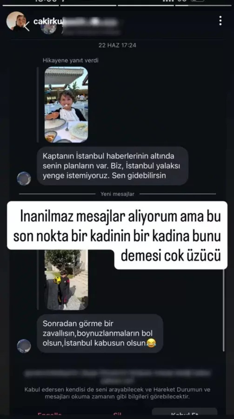 Galatasaray'ın kalecisi Uğurcan Çakır'ın eşi Kübra Çakır, "Bir kadının bir kadına bunu demesi çok üzücü" diyerek, Instagram'dan kendisine gönderilen bir mesajı paylaştı.