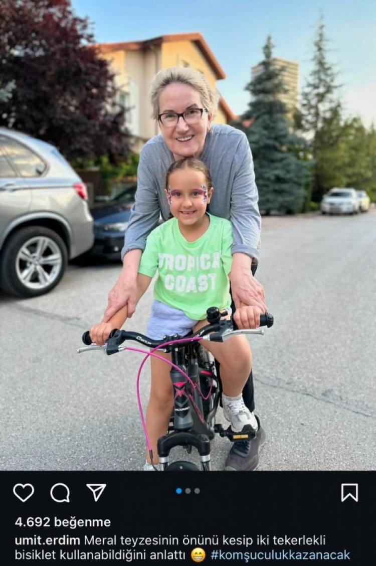 Aynı zamanda komşusu olan Akşener ile kızı bisiklet sürerken karşılaşan Ümit Erdim paylaşımında, "Meral Teyze'sine iki tekerlekli bisiklet kullanabildiğini anlattı" ifadelerini kullandı.