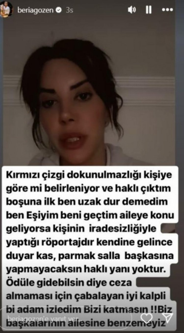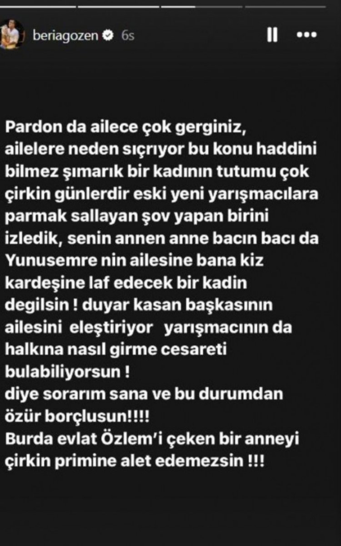 Yunus Emre'nin eşi Beria Özden bu sözleri duyunca çok sinirlendi. Sosyal medyada açıklama yapan Beria Özden, "Haddini bilmez şımarık bir kadının tutumu çok çirkin" dedi.